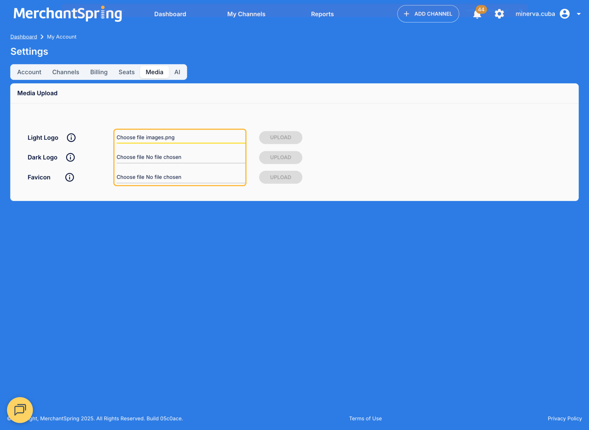Easily upload your MerchantSpring logos — add light, dark, and favicon files to personalize your account.
